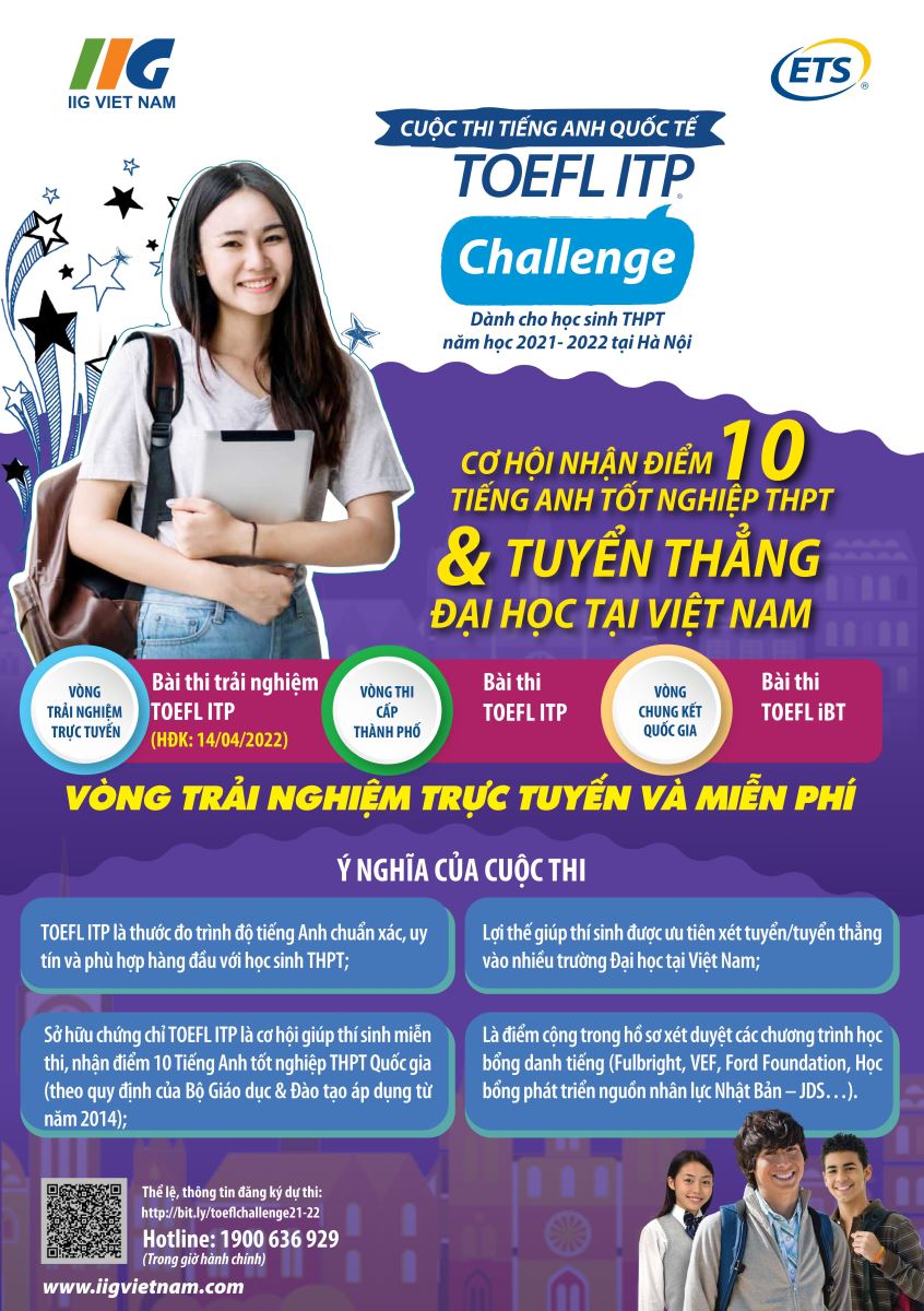 Tiếp nối thà !important;nh công của Cuộc thi tiếng Anh quốc tế TOEFL Challenge được tổ chức thường niên trong suốt 10 năm qua, BTC lần đầu ra mắt Cuộc thi TOEFL ITP Challenge 2021 -2022 dành cho học sinh THPT giúp góp phần nâng cao chất lượng dạy và học tiếng Anh tại các trường THPT hiện nay. Các thí sinh tham dự Vòng Tuyển chọn cấp Thành phố (Vòng 2) sẽ được nhận Phiếu điểm TOEFL ITP quốc tế do ETS cấp có giá trị toàn cầu. Với chứng chỉ TOEFL ITP đạt 450 điểm trở lê !important;n, các em được miễn thi môn tiếng Anh trong kỳ thi THPT quốc gia, đồng thời có ưu thế khi xét tuyển vào các trường đại học uy tín trong nước (Tham khảo:  !important;Danh sách trường Đại học tuyển sinh bằng chứng chỉ TOEFL ITP).  !important;Thô !important;ng qua Cuộc thi, Nhà trường cũng sẽ có kết quả đánh giá chính xác và khách quan về năng lực sử dụng tiếng Anh và sự tiến bộ của học sinh, từ đó đưa ra những giải pháp phù hợp cho công tác nâng cao chất lượng dạy và học tiếng Anh trong Nhà trường.
